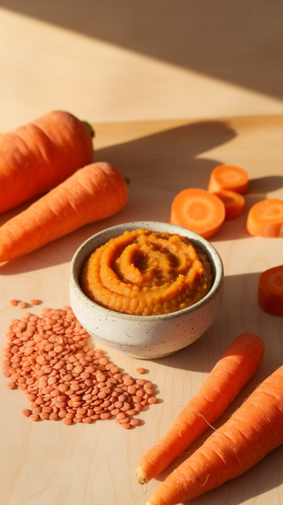 Babies eventually need more than fruits and sweet vegetables. Lentils add gentle plant-based protein while carrots keep the flavor mild and friendly. When cooked until very soft, lentils blend surprisingly smooth. This puree feels a little more substantial without being heavy.