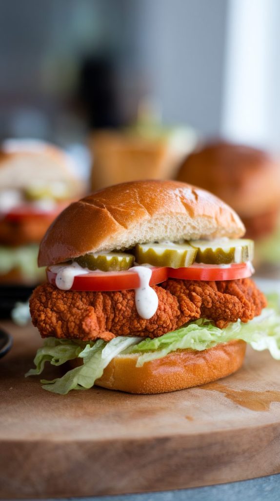 Grill or pan-sear your chicken until fully cooked, toss in Buffalo sauce, then layer it on your bun with all the fixings.