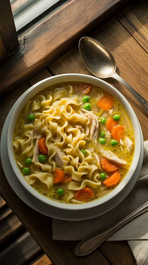 A comforting bowl of golden chicken noodle soup with peas, carrots, and noodles in a rustic ceramic bowl. Soft window light, cozy kitchen mood, no people.