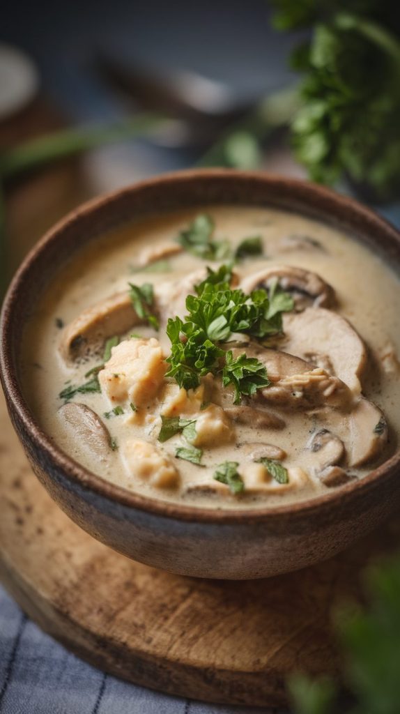 A creamy mushroom and chicken soup with sliced mushrooms and parsley in a white bowl on a wooden table. Soft café lighting, cozy autumn vibe.