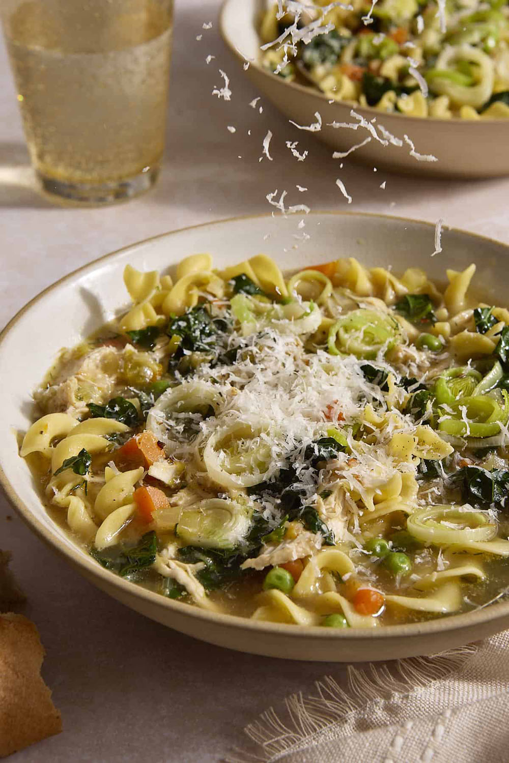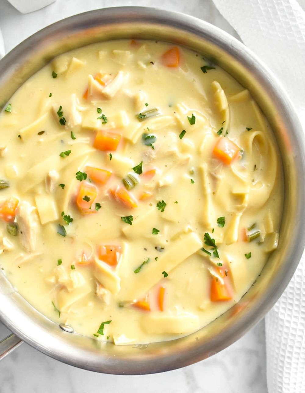 The texture is dreamy, thanks to a splash of cream stirred in at the end, and it’s packed with shredded chicken, egg noodles, and cozy hints of thyme and parsley. It feels indulgent but still totally weeknight-ready. A sprinkle of grated Parmesan on top takes this over the edge.