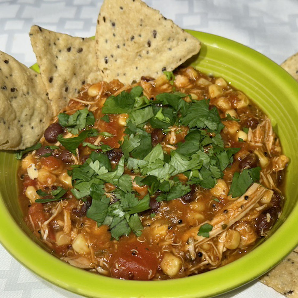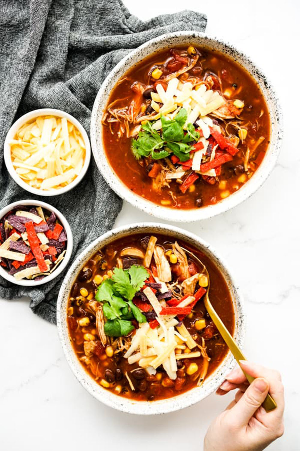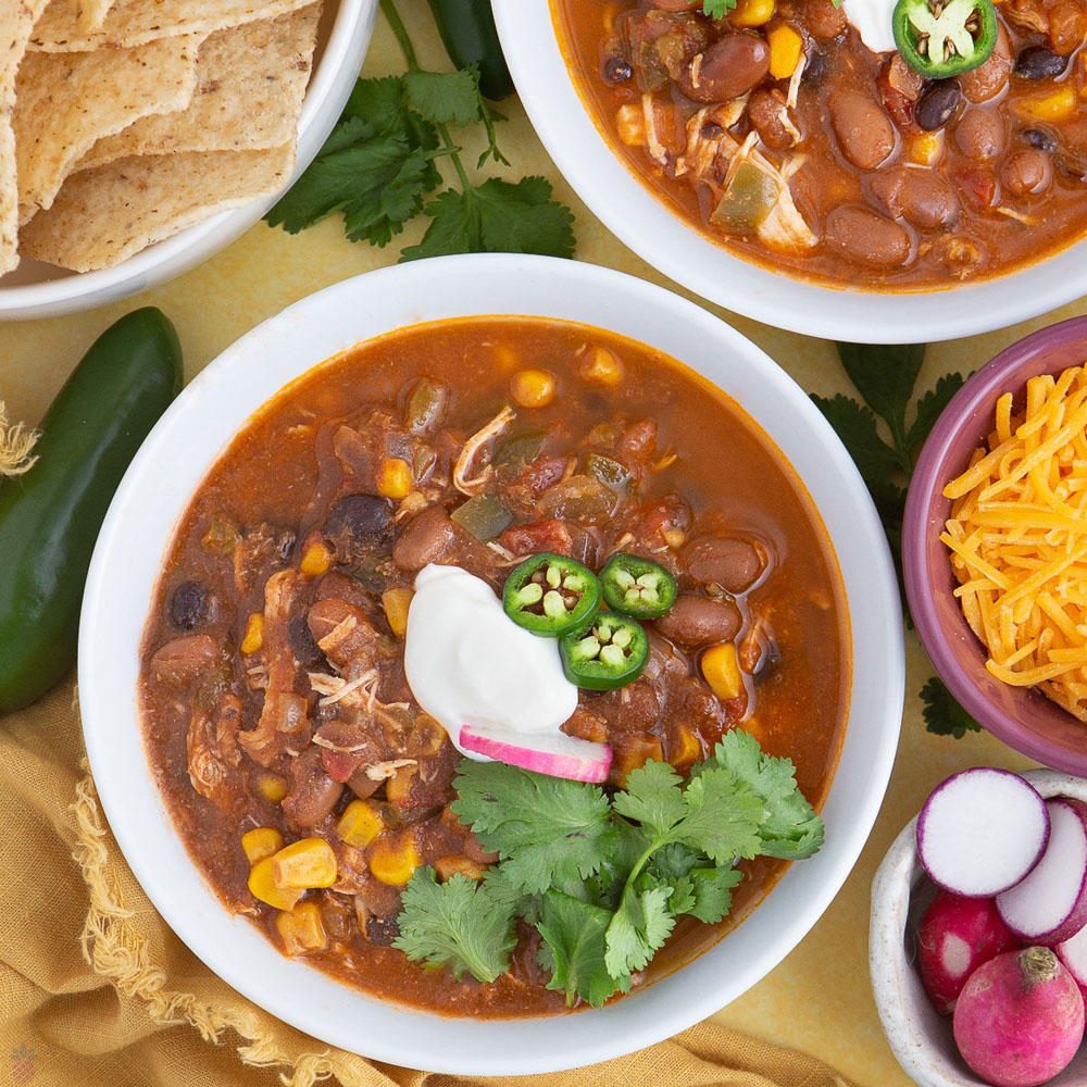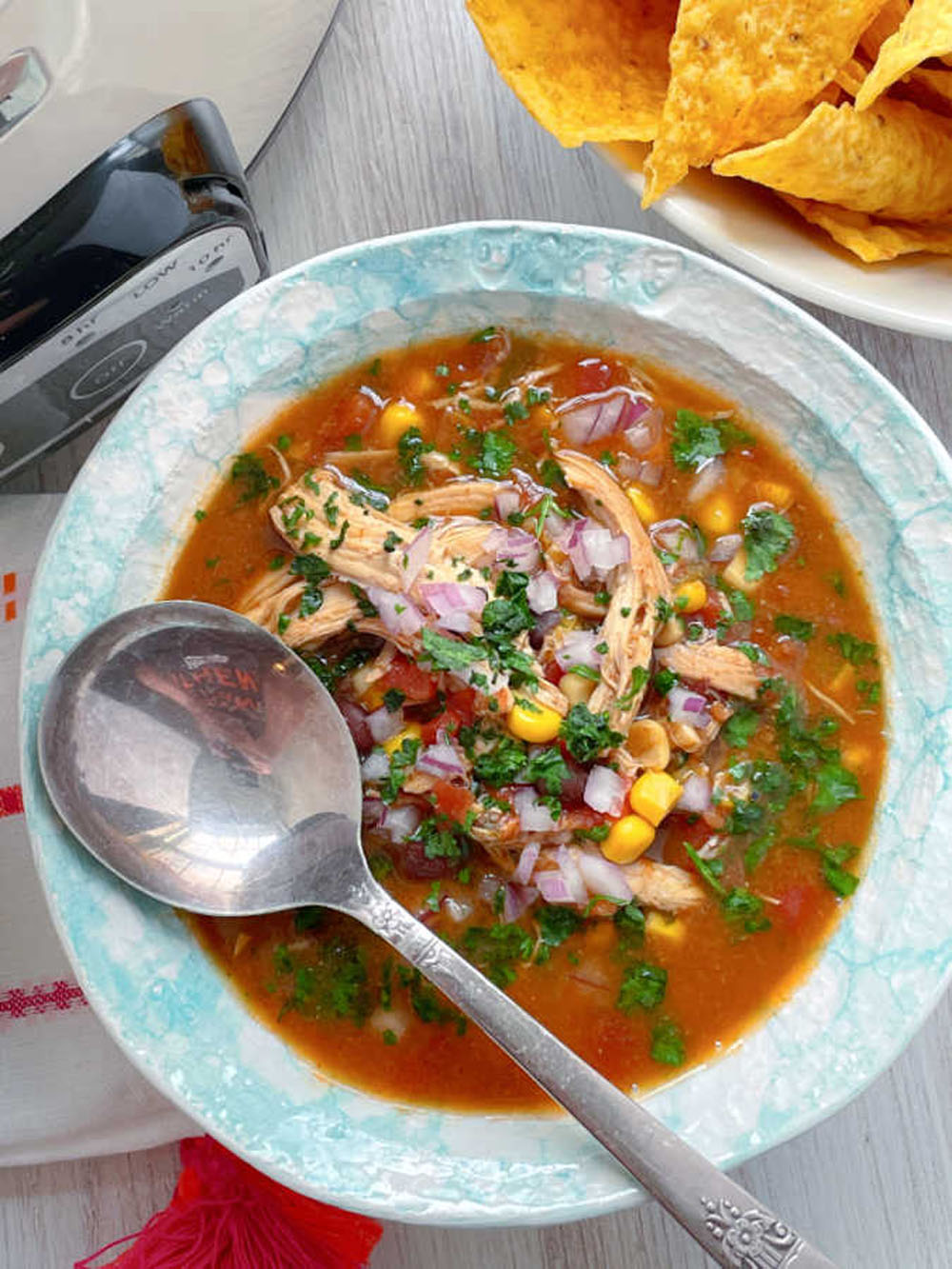 Think tender shredded chicken, spicy broth, beans, corn, and all your favorite toppings—ready to ladle into bowls after a few hours in the slow cooker.
