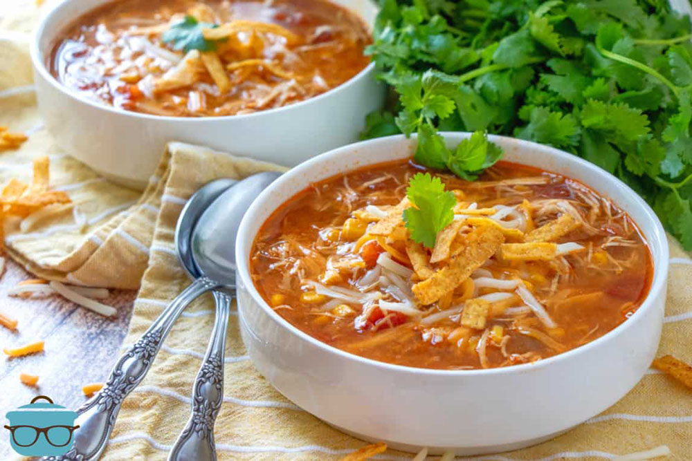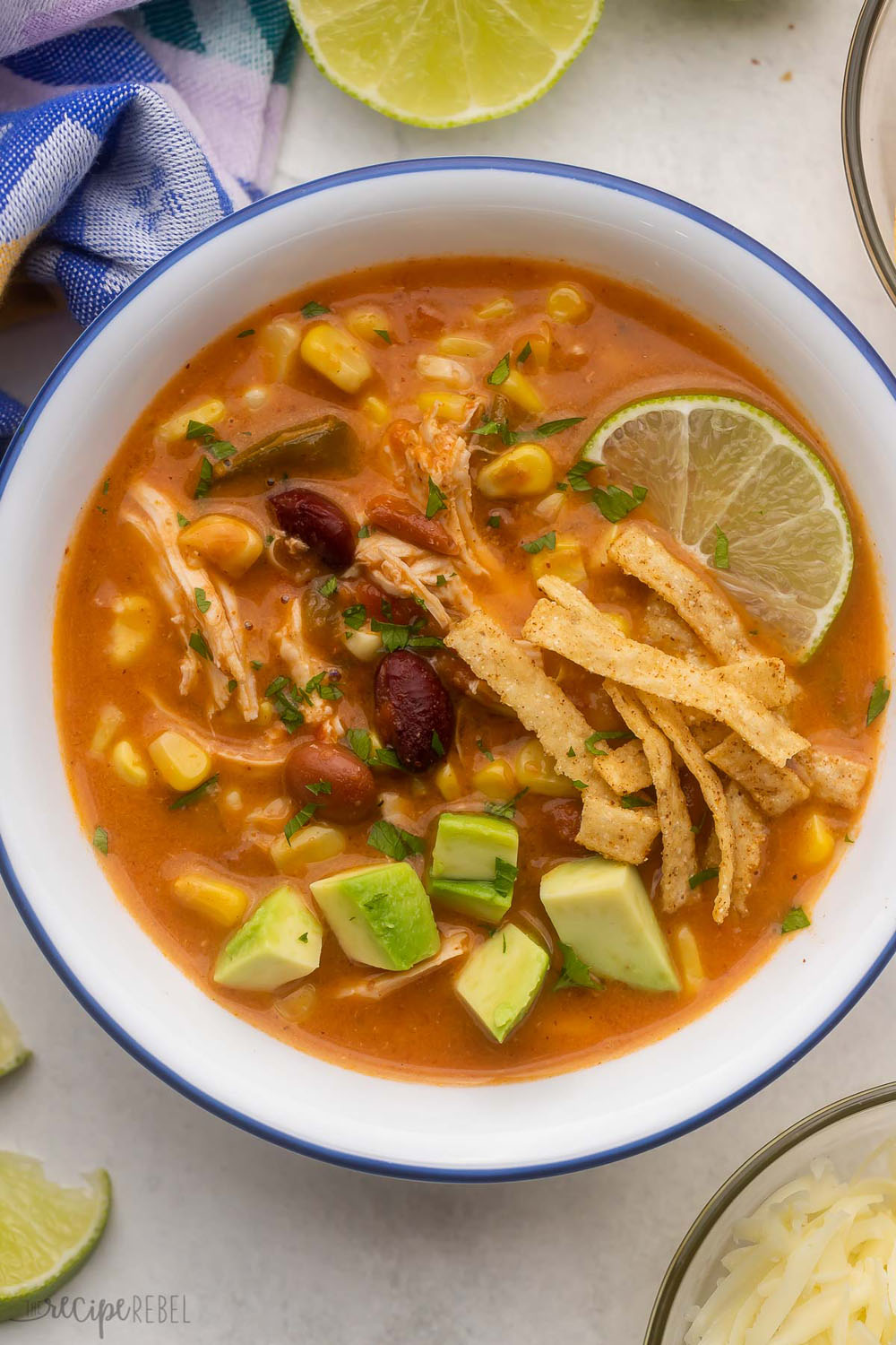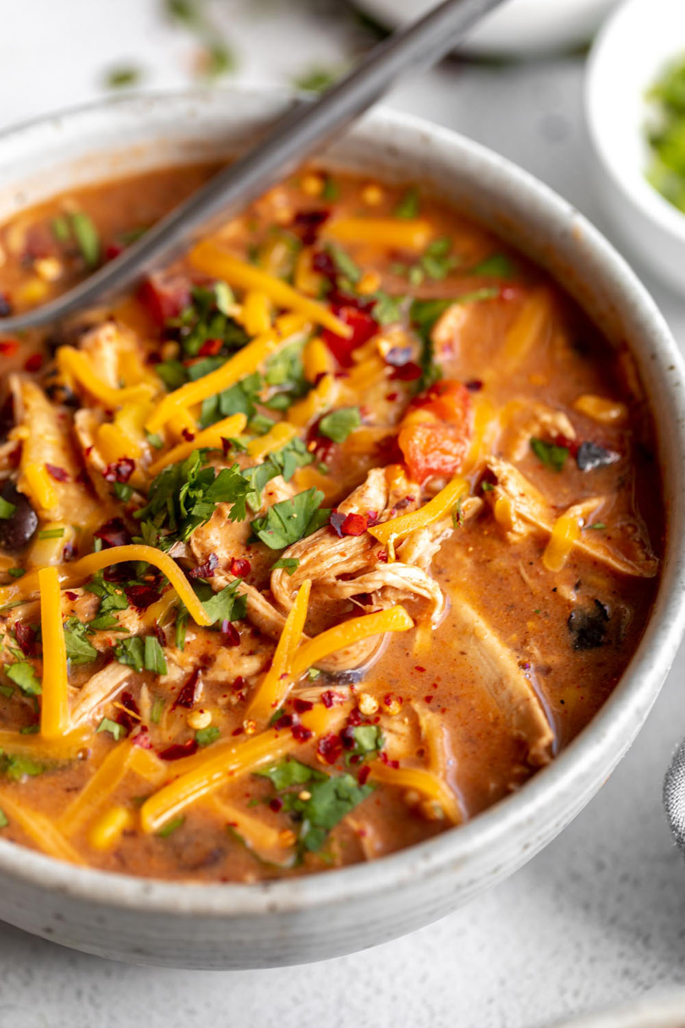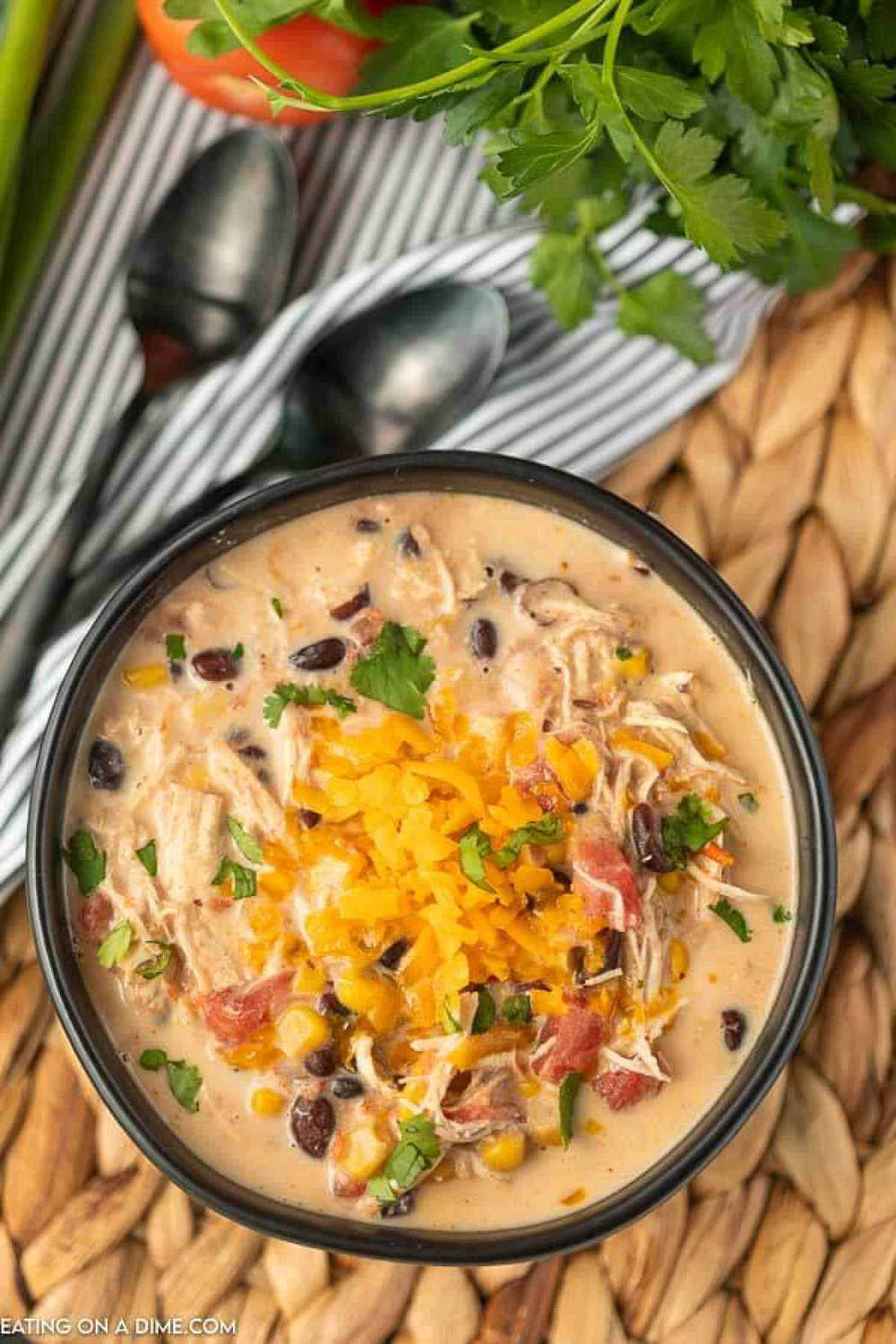 Think tender shredded chicken, spicy broth, beans, corn, and all your favorite toppings—ready to ladle into bowls after a few hours in the slow cooker.