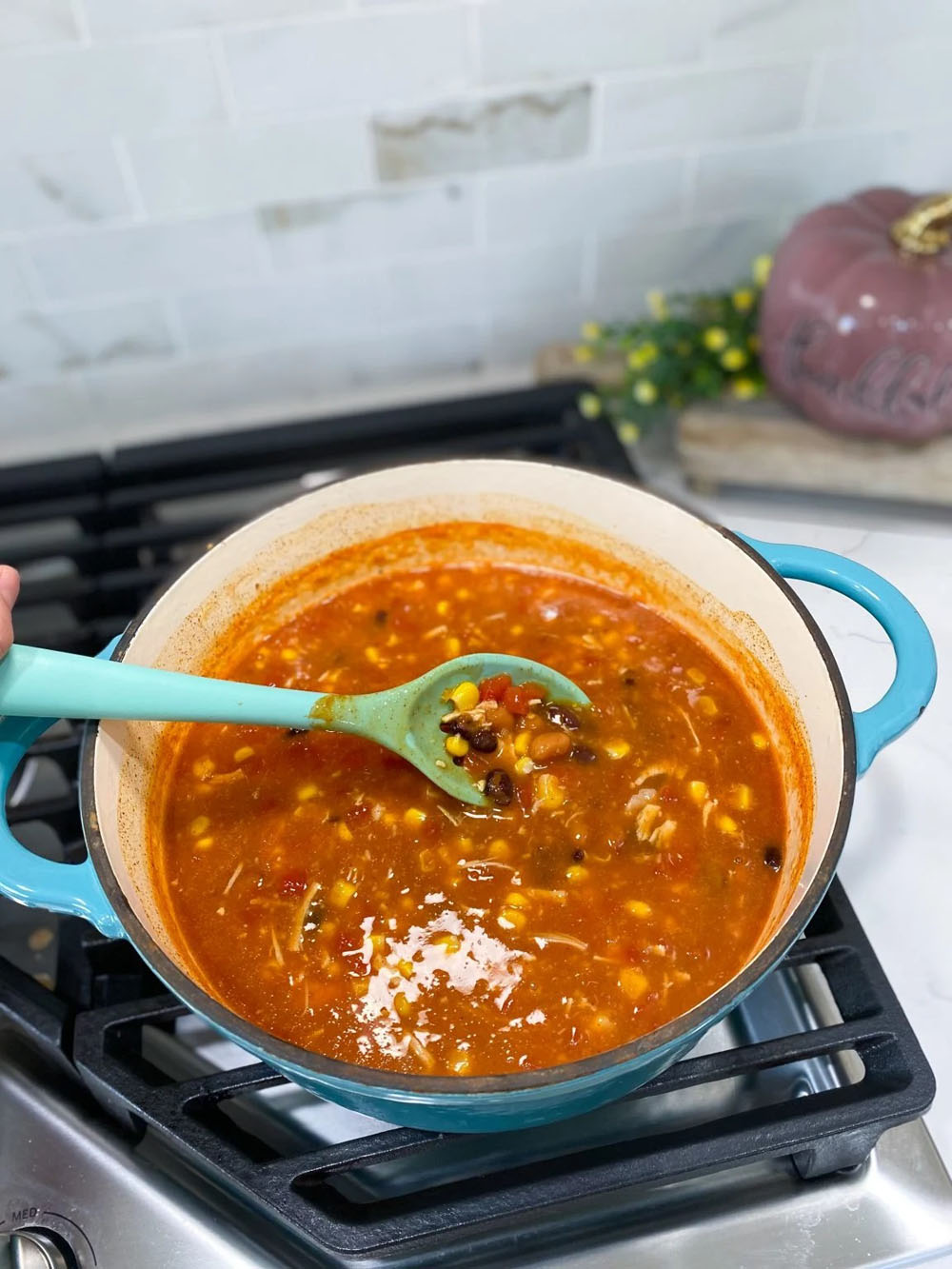 Bold, tomato-forward, and with a hint of spice—that’s what you get when you add Rotel and Mexican oregano to the mix. This soup uses Rotel (a mix of diced tomatoes and chilies), tomato sauce, beans, corn, broth, garlic, chili powder, cumin, smoked paprika, and oregano.