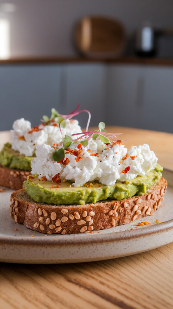 Plain avocado toast can feel incomplete after an hour. Adding cottage cheese turns it into a balanced, high-protein lunch that actually holds you over. The creaminess blends beautifully with mashed avocado. I didn’t expect it to work the first time I tried it, but now I refuse to skip it.