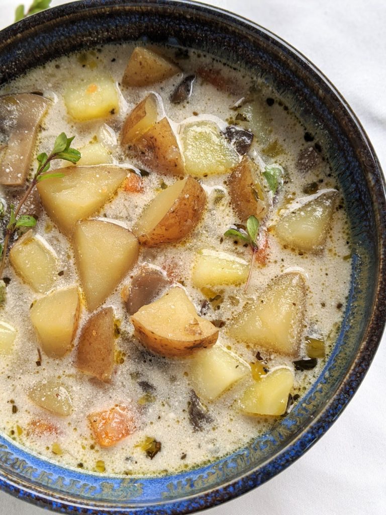 It’s warm, satisfying, and plant‑based. What makes it amazing is how approachable it is. “Regular” potatoes, familiar veggies, garlic and herbs, simmered in broth, then finished with coconut milk.