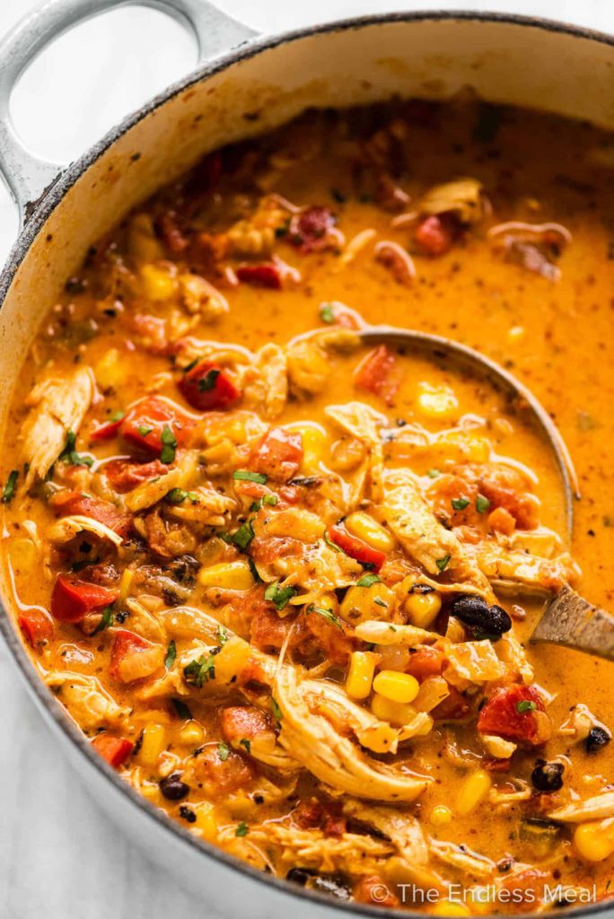 This one wraps you in a warm, flavorful hug—think Rotel tomatoes and cream cheese swirling into a dreamy broth with tender chicken, corn, and black beans. It’s cozy, satisfying, and done in just 35 minutes on the stovetop (or Instant Pot or crockpot if you’re multi-tasking).
