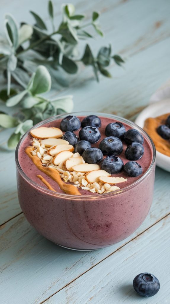 - Blend blueberries, banana, almond butter, milk, and vanilla.