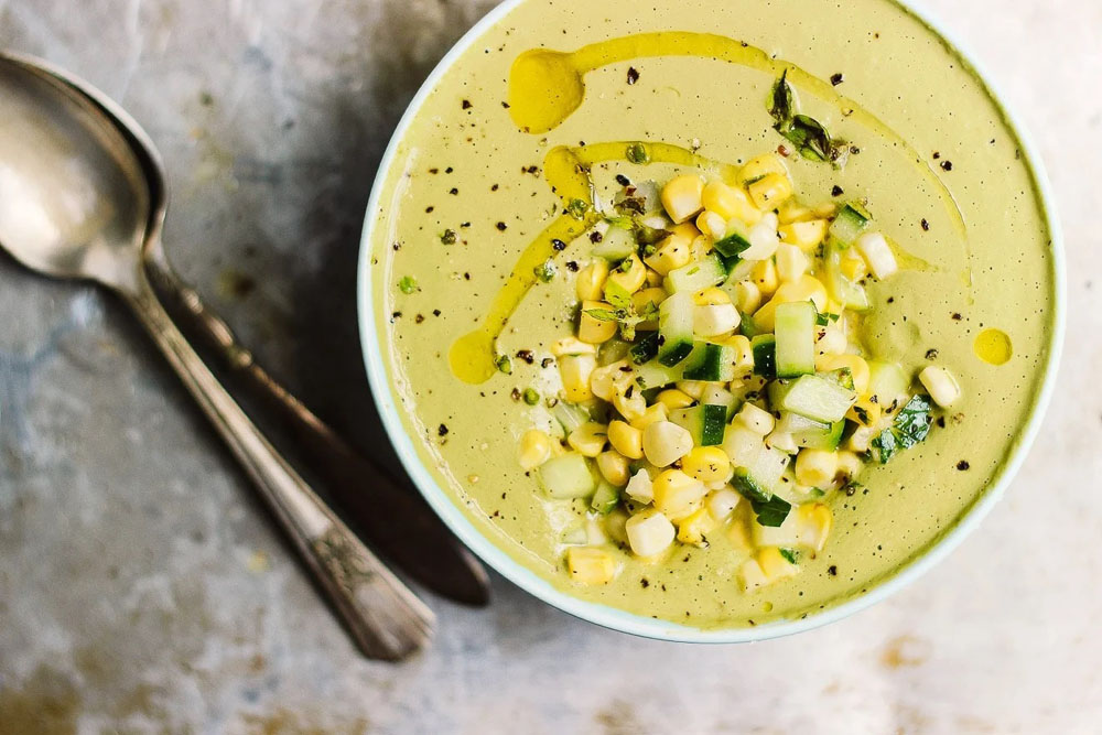 10. Chilled Cream of Basil Soup with Corn‑Cucumber Salad
