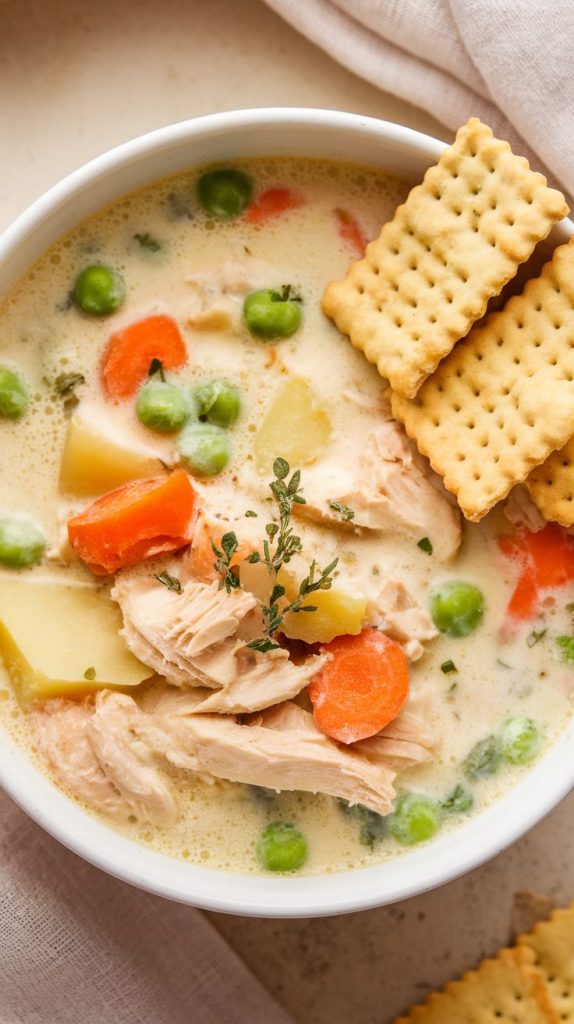 Serve with: Crumbled pie crust or buttery crackers on top — you’ll get that same pot pie vibe.