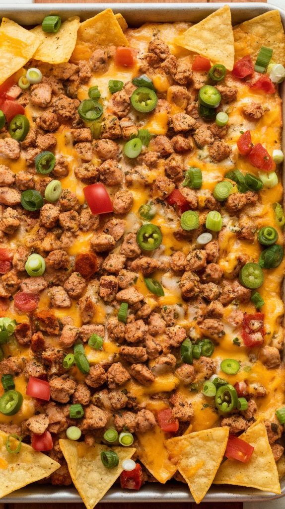 Cheesy layers, tender ground chicken, and crispy chips—this tray disappears shockingly fast. It’s effortless and festive, perfect for Friday nights when cooking feels optional. You can add jalapeños, olives, or keep it simple.