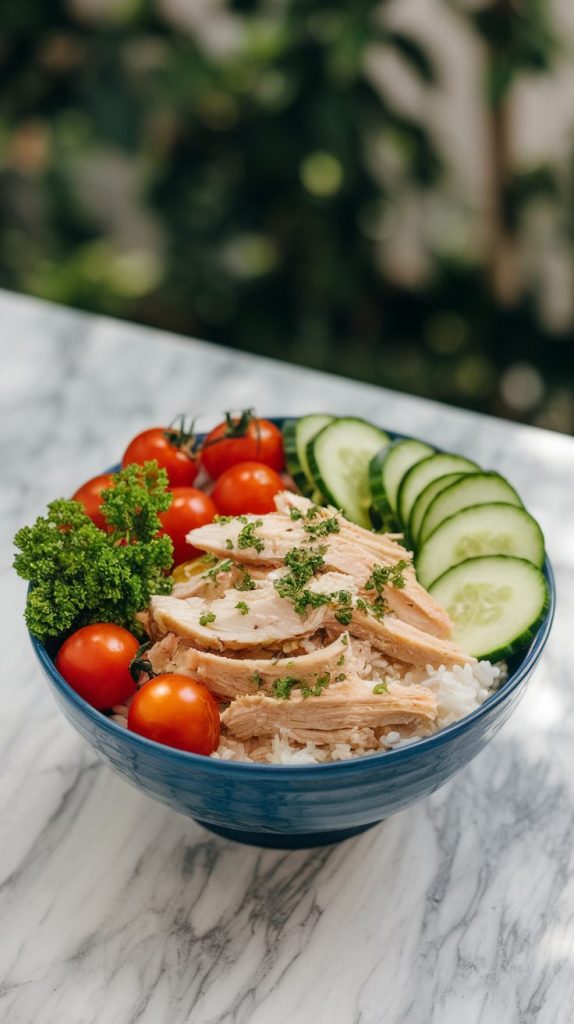 These bowls are fresh, vibrant, and surprisingly energizing. The lemon adds brightness, the herbs bring fragrance, and the shredded chicken ties everything together.