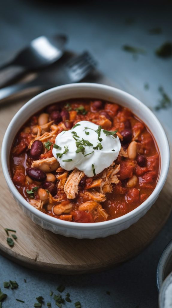 This shredded chicken chili is hearty, bold, and deeply comforting. It’s thick enough to stand up to a spoon and flavorful enough to serve all on its own.