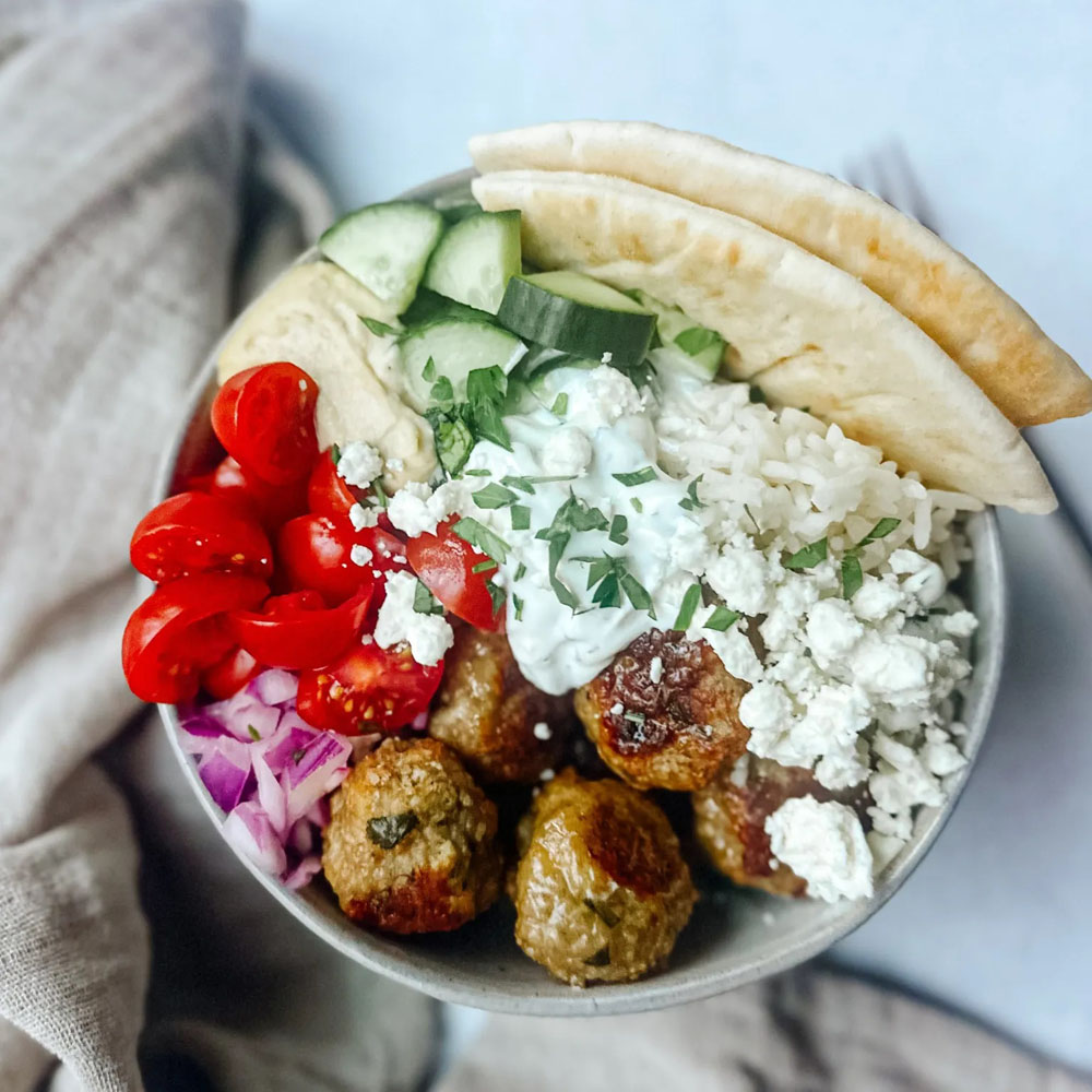 Quick tip: bake meatballs ahead of time and heat when ready. Use brown rice or cauliflower rice for lighter carbs. If you don’t have tzatziki, get Greek yogurt + cucumber + garlic + lemon mix. Flatbread on the side if you want something to scoop with.