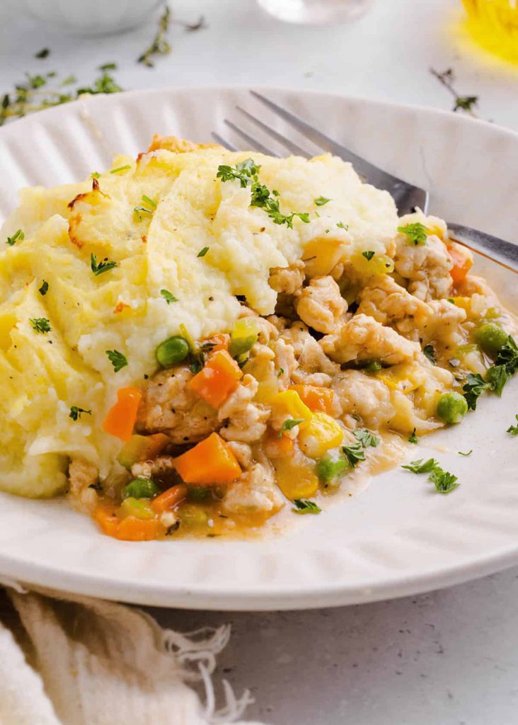 Quick tip: swap in sweet potatoes for some color and added nutrients. Use whatever frozen veggies you have to save prep time. Best served with a side salad to cut through richness.