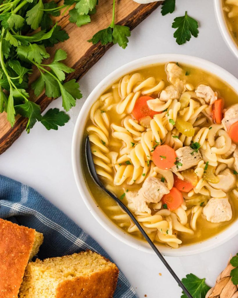You’ll taste the brightness from a squeeze of lemon at the end and the gentle thyme adds a whisper of herb‑kissed depth. Pro tip: swap in leftover shredded chicken and save time—plus, Barilla gluten‑free rotini or Jovial noodles soak up the broth just right.