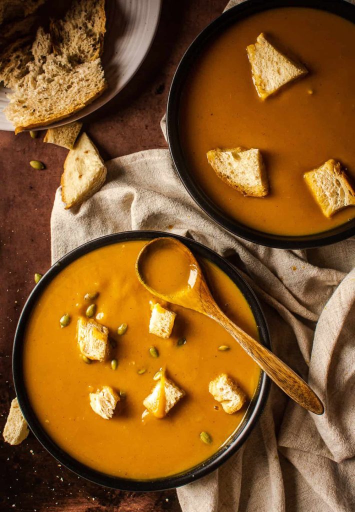 This one practically screams fall vibes—creamy, naturally sweet butternut squash blended with coconut milk and topped with roasted pepitas for a fun crunch.