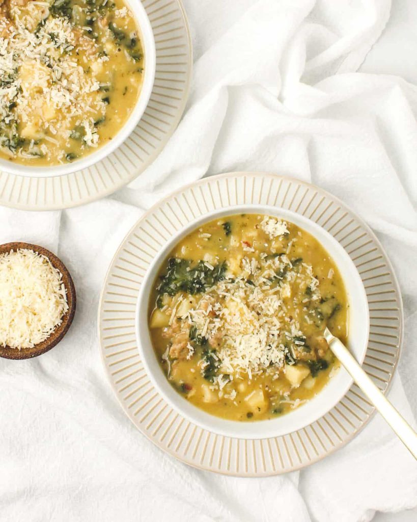 This one’s a hearty hug in a bowl that feels rustic and rich—but without any dairy. Potatoes and cauliflower create a silky, creamy base, while sausage and kale bring layers of savory goodness.