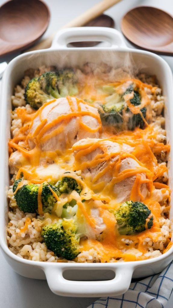 - Mix chicken, rice, broccoli, and seasonings in a baking dish.