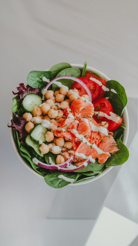 This salad feels hearty thanks to chickpeas but stays refreshing with crisp veggies and lemony dressing. The salmon adds protein and savory richness. It’s the kind of lunch that keeps you energized all afternoon.