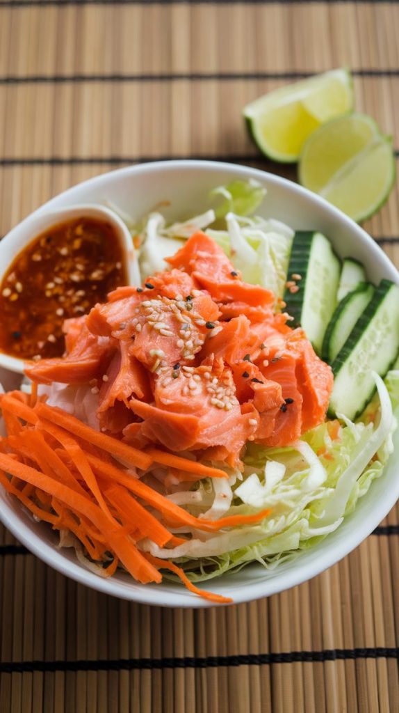If you want a lunch that wakes up your taste buds, this one does the job. The noodles soak up the spicy dressing, and the salmon adds a rich, savory contrast.