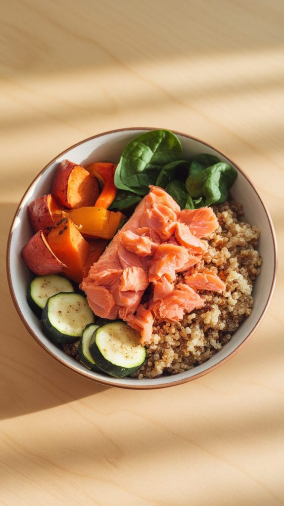 This bowl is a powerhouse of nutrients without sacrificing flavor. The roasted veggies bring sweetness, while the fluffy quinoa keeps things hearty. The salmon ties it all together with rich, savory notes.