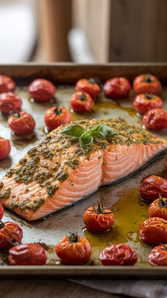 4. Pesto Salmon with Roasted Cherry Tomatoes