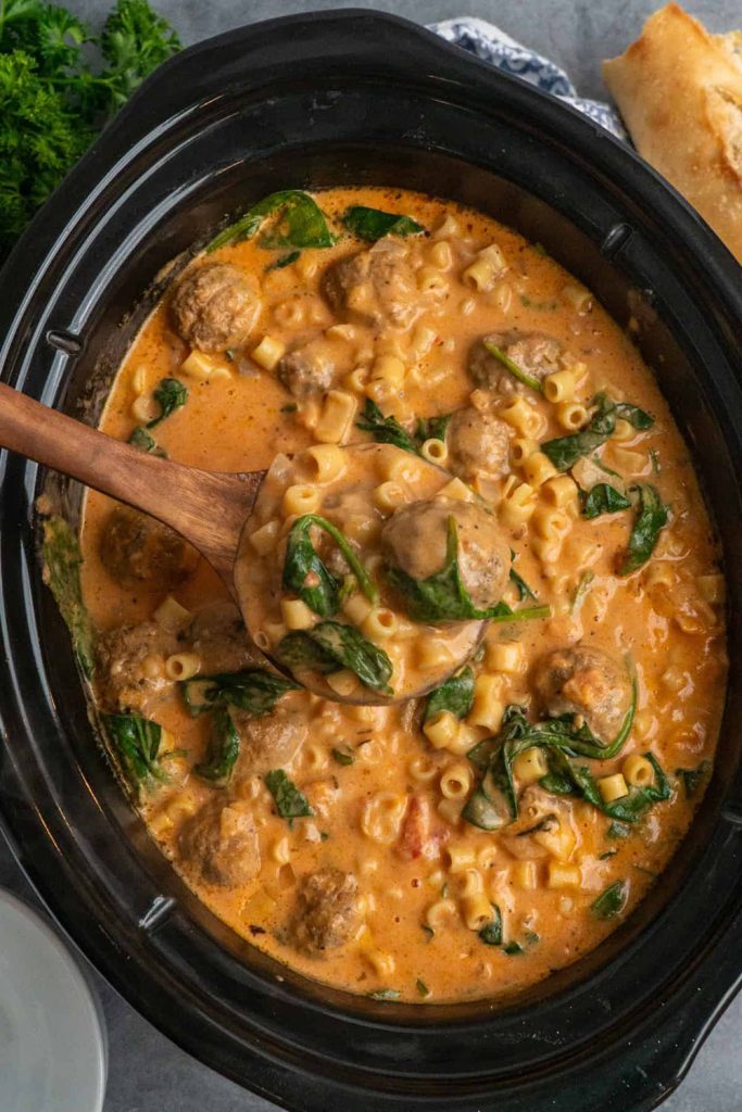 When lazy comfort food wins, this is your go‑to: meatballs, veggies, pasta, and broth all tossed into a slow cooker and left to do their thing until dinner time.