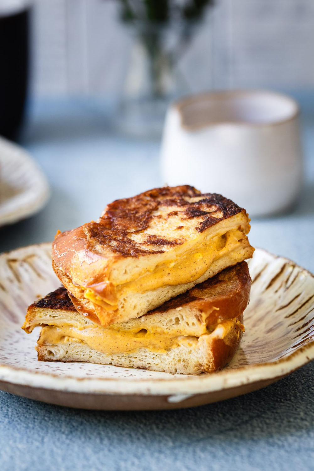 Thick slices of challah or brioche are stuffed with a creamy, spiced pumpkin‑cheesecake filling, dipped in an egg‑milk bath, then griddled to golden perfection. The result? A breakfast sandwich that oozes warm pumpkin flavor when cut, with a tender, custardy exterior.