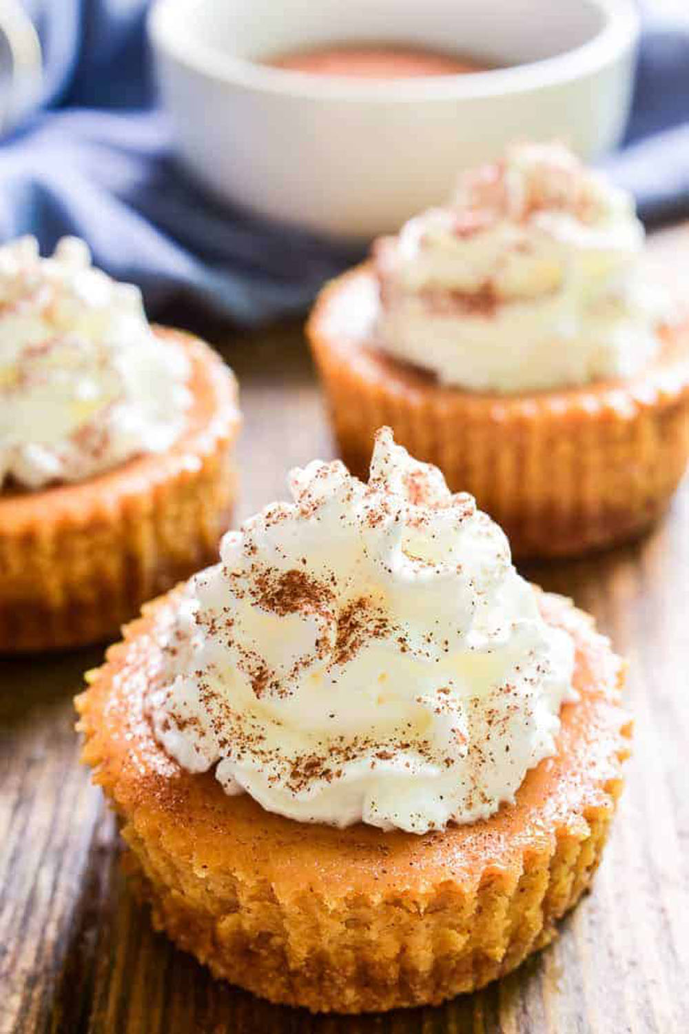 Each little muffin-tin cheesecake starts with a graham cracker crust packed tight and topped with a creamy pumpkin-spiced filling that bakes into perfectly portioned delights. They’re velvety and rich, with warm cinnamon, nutmeg, and ginger swirling through every bite.
