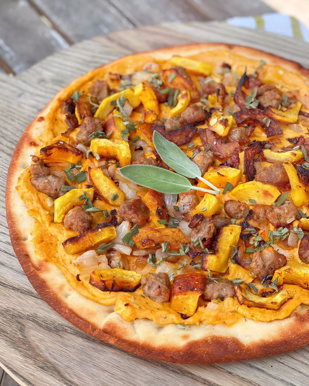 This flatbread is fall’s answer to pizza—and it’s stunning. The base is creamy pumpkin‑goat cheese spread (goat cheese blended with pumpkin puree and honey), topped with crumbled sausage, roasted squash, sautéed onions, and fresh sage.