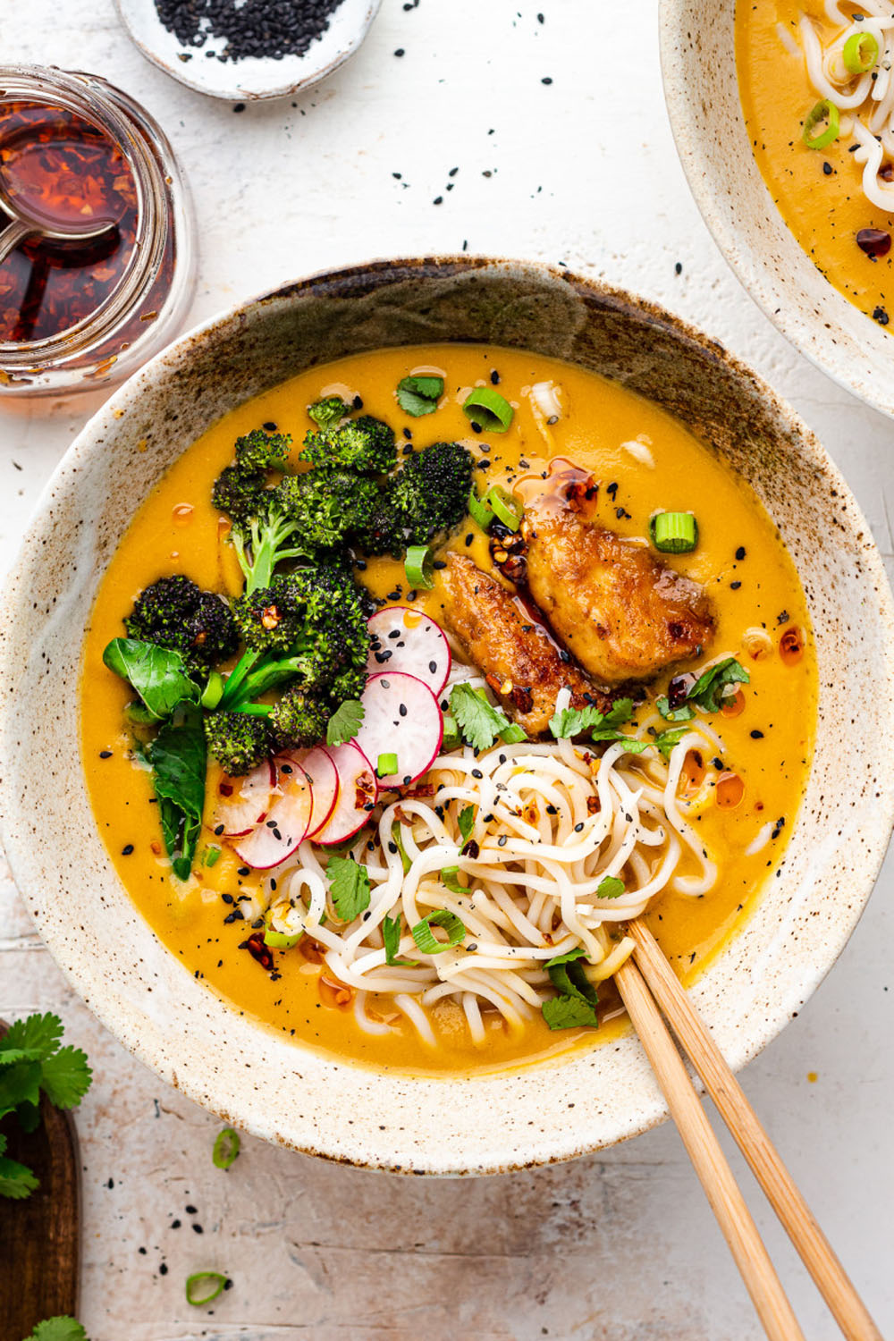 The broth is creamy yet light, spiced with umami from miso and mellow sweetness from pumpkin.