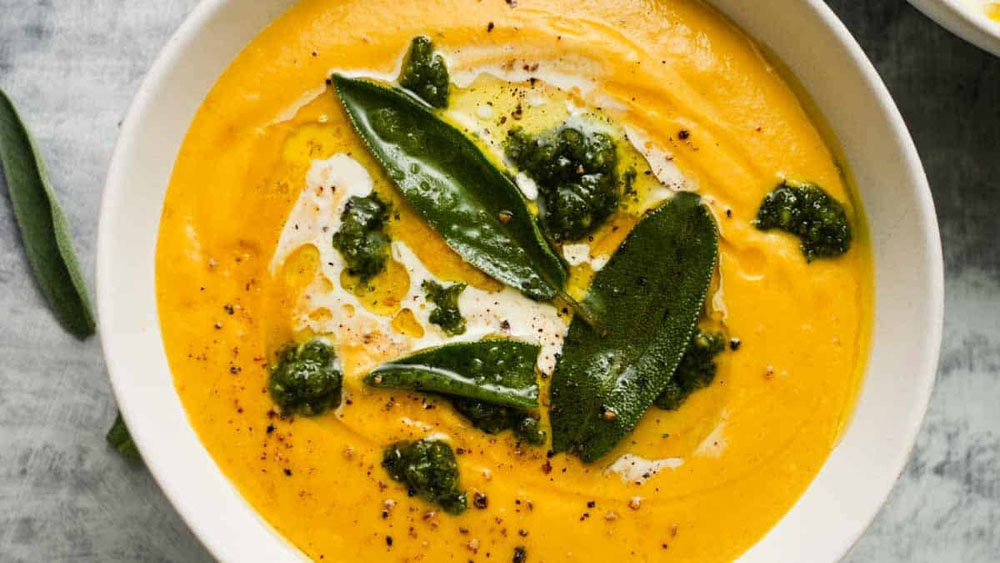 A swirl of cream and a splash of sherry vinegar add tang and richness. Top it off with homemade pesto—basil, sage, garlic, pumpkin seeds and Parmesan—for a green-herb punch that lifts the whole bowl.
