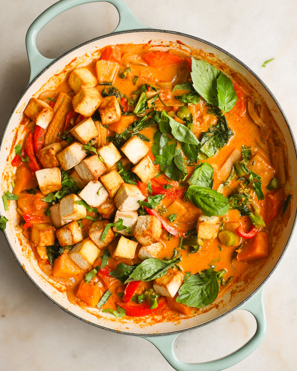 Each spoonful is layered—sweet pumpkin, spicy curry, tangy lime, and fragrant Thai basil creating a feast for both taste and soul. It balances protein and plant-based goodness in a creamy, warming sauce that feels like a hug.