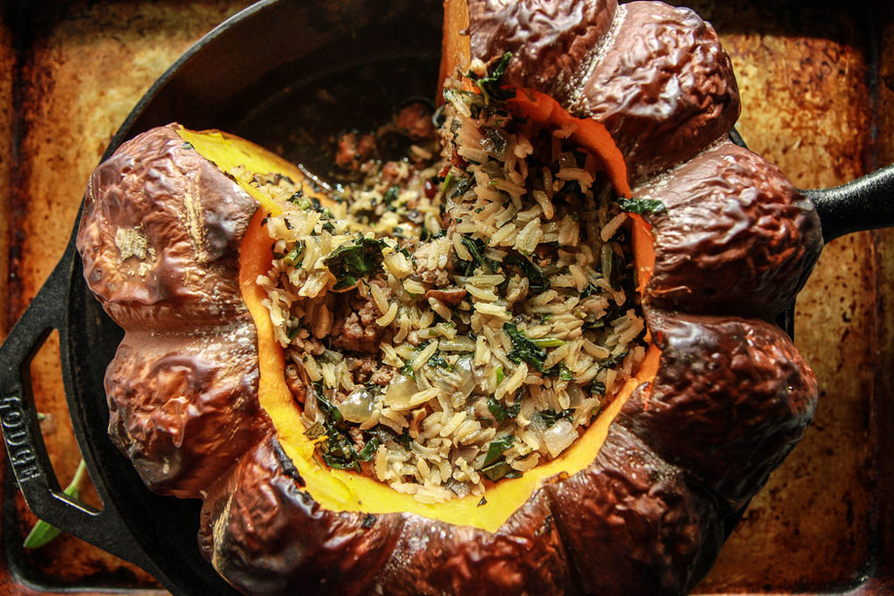 Every scoop combines creamy pumpkin flesh with nutty, chewy staples and meaty boldness. It’s part side dish, part center-stage showstopper—and leftovers taste even better the next day.