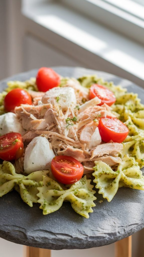 This dish is basically the “someone said they’re dropping by in 20 minutes” lifesaver. Pesto brings bold basil flavor, the bowtie pasta catches every bit of sauce, and the chicken makes it feel like a full meal.