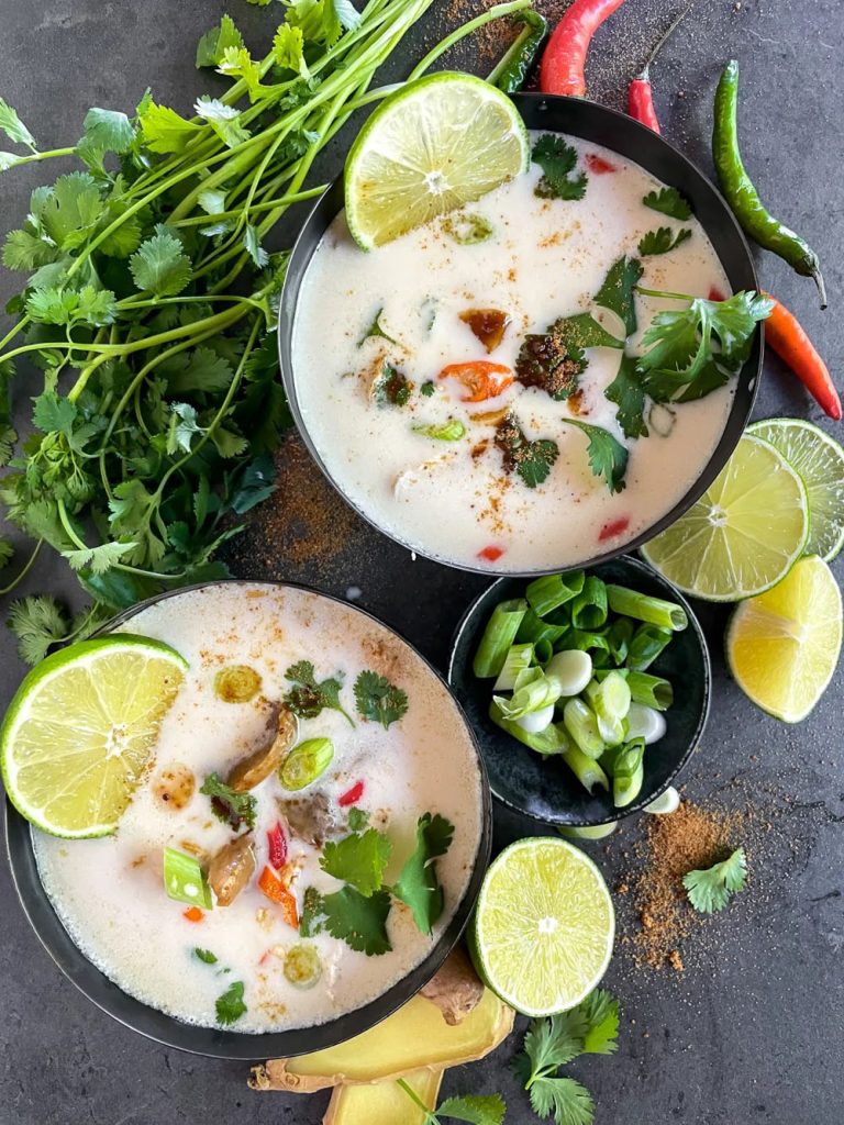This soup whispers bold flavor, but still hugs you back. Coconut milk, lemongrass, ginger, lime juice, lime zest, Thai chili sauce, a splash of fish sauce, mushrooms, and shredded rotisserie chicken make this something special. Every spoonful feels like cozy with a side of zing.