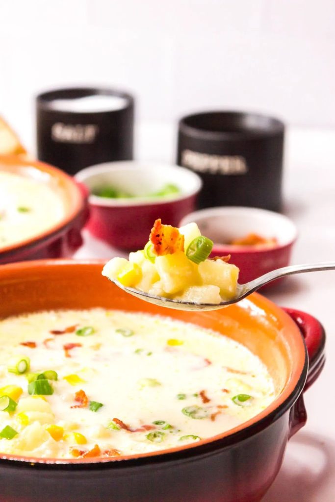 This one is thick, rich, and like winter in a bowl. Chunks of potato, sweet corn, shredded rotisserie chicken, creamy milk and heavy cream, and little bites of bacon make it feel indulgent but still easy.