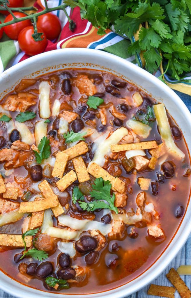 It’s loaded with shredded rotisserie chicken, beans, veggies, and a zippy broth that’s begging for a good dollop of toppings like crisp tortilla strips, creamy sour cream, and melty cheddar. Every spoonful is a fiesta with just enough savory punch and fresh zing.