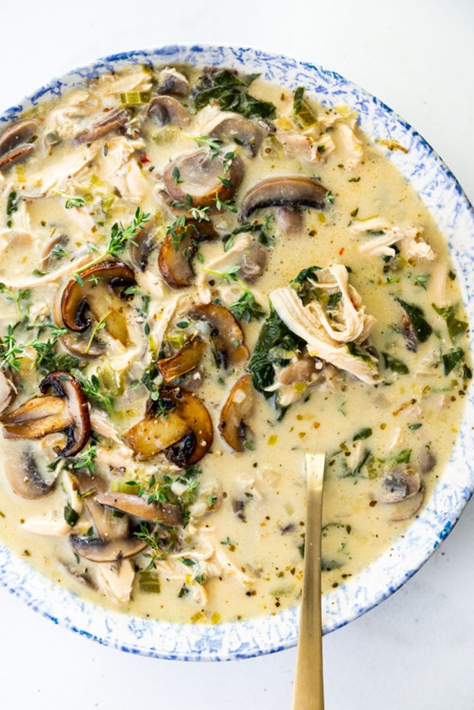 This one’s pure, earthy comfort in a bowl—golden-brown mushrooms, tender chicken, cream, and a touch of thyme that just warms you from the inside out.