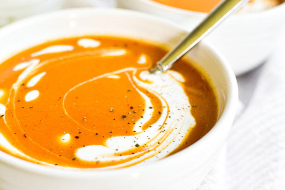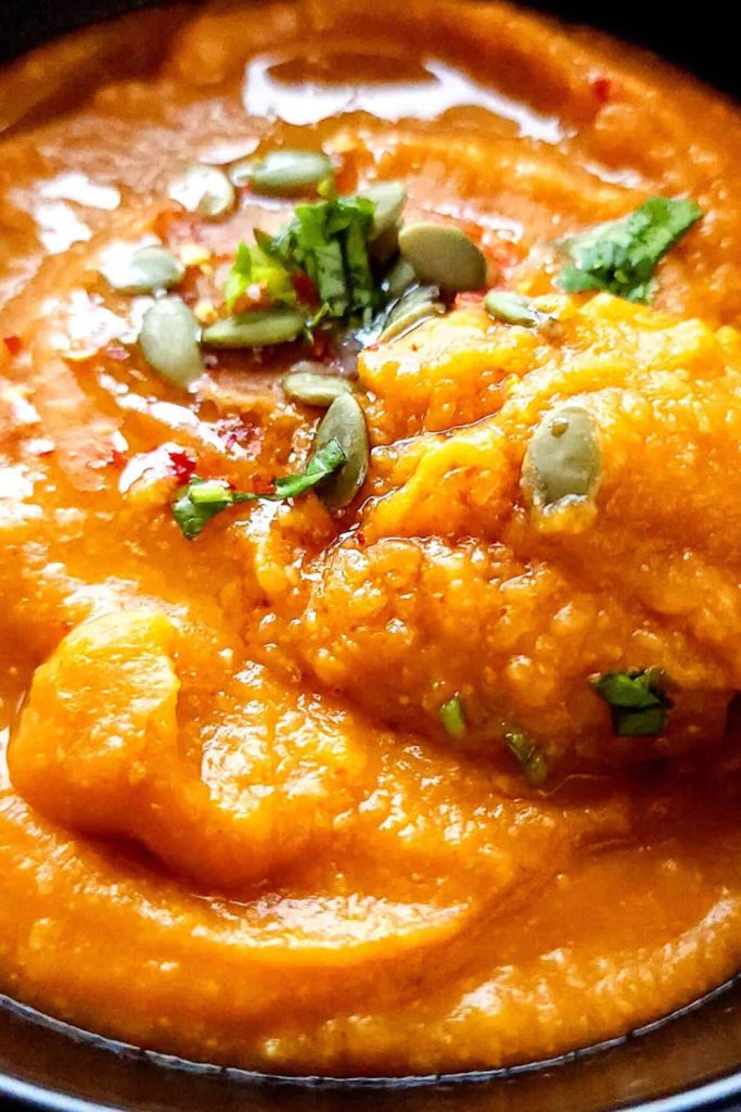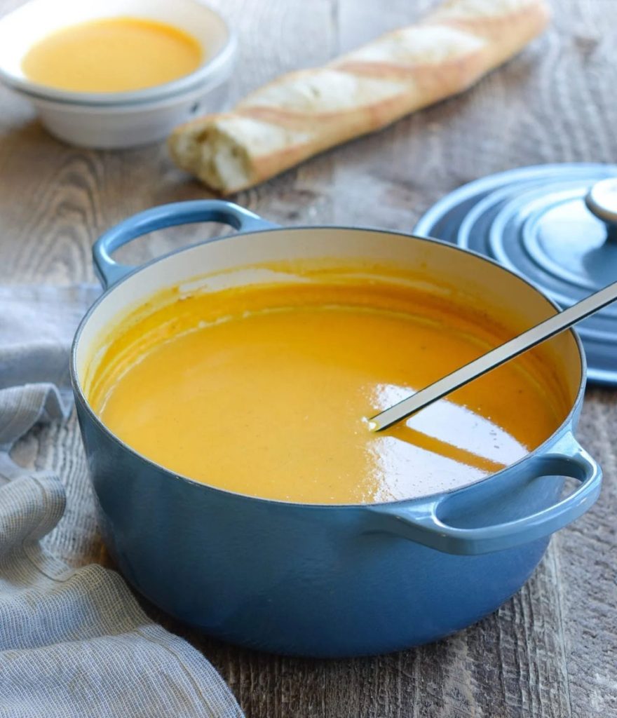The recipe often uses a sheet-pan roasting step that brings out caramelization. It’s blended smooth with vegetable broth and coconut milk for creaminess without dairy.