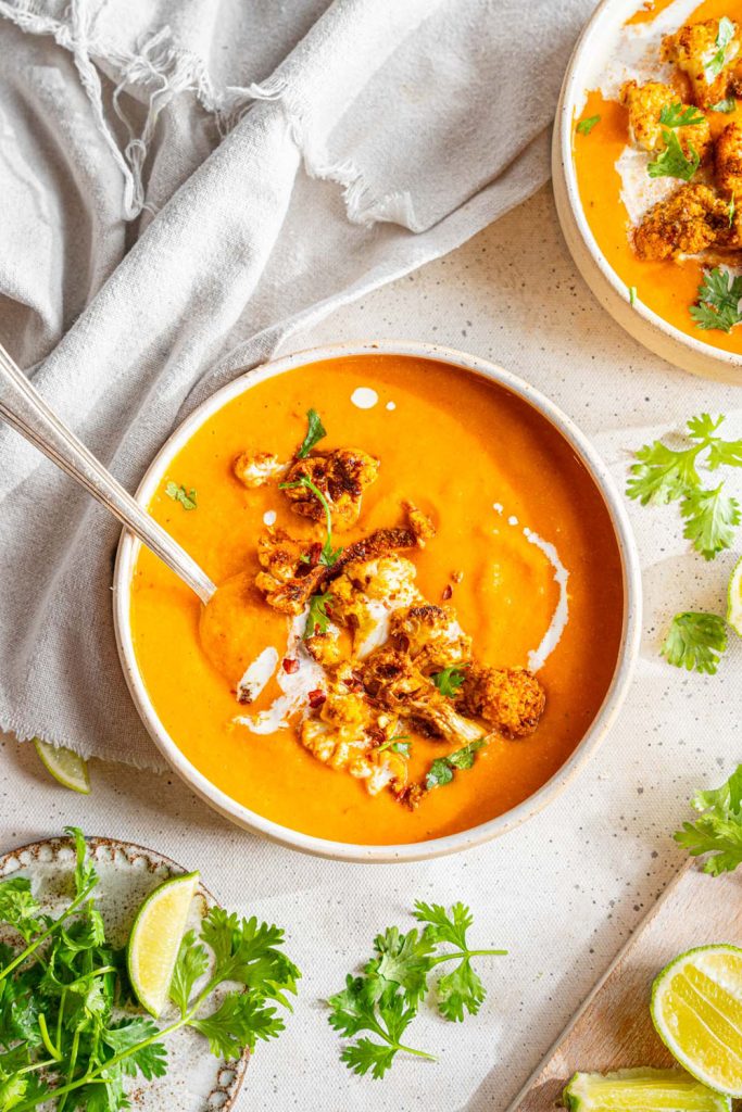Here’s a soup that’s plant-based, vibrant, and budget-friendly. Sweet potatoes and cauliflower roasted together with bell peppers, garlic, and shallots give both color and flavor depth.