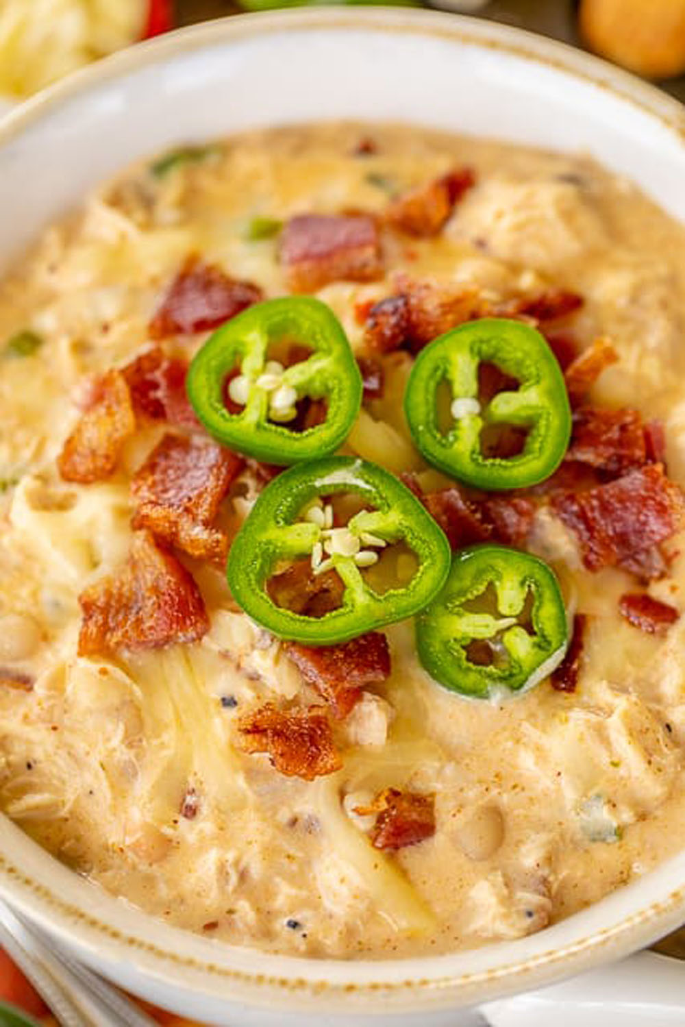 Picture chunks of rotisserie chicken mingling with crisp white beans, bacon bits, jalapeños, onions, and garlic in a creamy broth spiced with cumin and chili powder. The real showstopper?